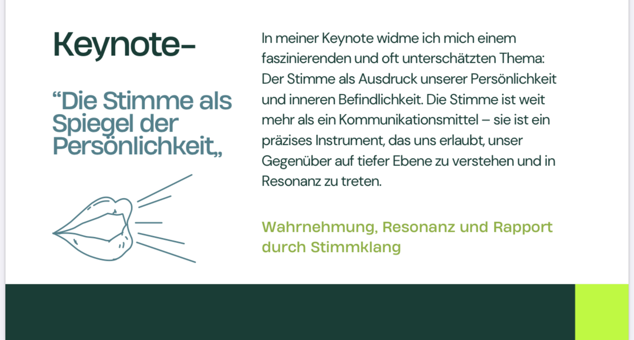 In den Keynotes und Workshops lade ich euch ein, eure Stimme als kraftvolles Werkzeug zu nutzen, um eure Botschaften mit Tiefe und Nachhaltigkeit zu vermitteln, eine fesselnde Wirkung zu erzielen und eine verbindende Kommunikation zu gewährleisten.